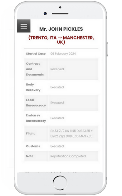 Sei informato su ogni fase del rimpatrio, dagli appuntamenti con le autorità agli spostamenti del defunto, per garantirti piena trasparenza in ogni momento.